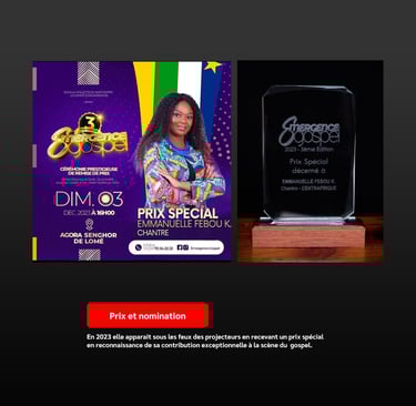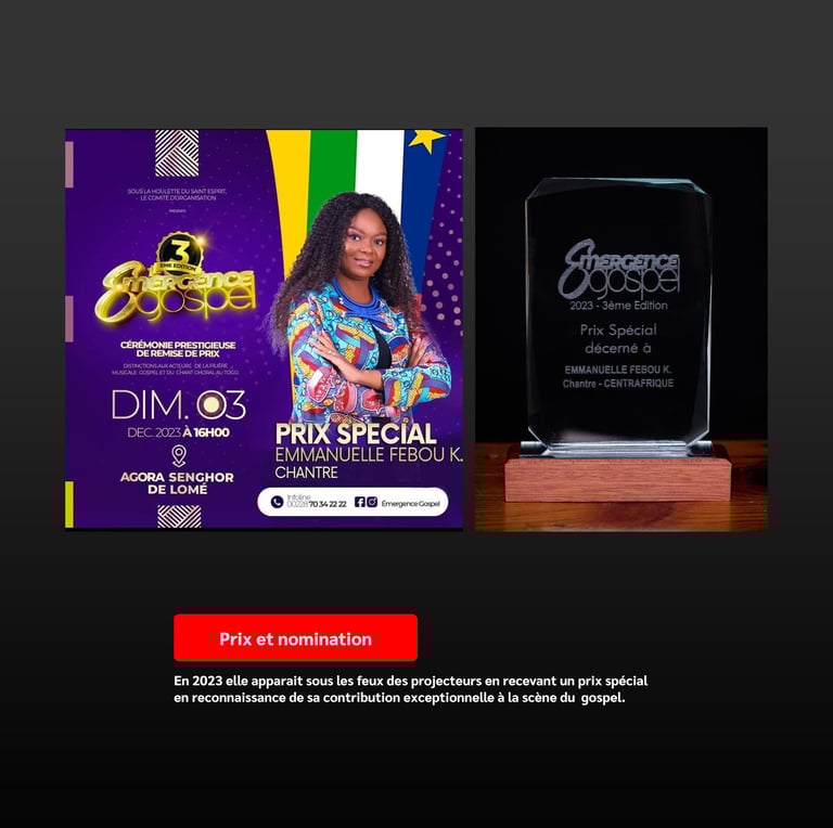 La chantre Emmanuelle Febou Koïngbo a reçu le "PRIX SPECIAL" de la 3ème édition de la cérémonie prestigieuse de remise de prix Emergence Gospel, après avoir été nominé pour ce prix de distinction aux acteurs cachés de la filière Gospel et du chant chorale au Togo.